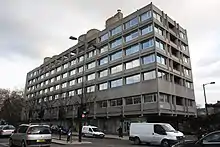 The Embassy of Czechoslovakia was originally located on Grosvenor Place, before moving to the location of the current Czech and Slovak embassies in 1970.[2] The construction of a new brutalist-style building at this site had begun in 1965 and was undertaken by Jan Bočan, Jan Šrámek and Karel Štěpánský from the atelier Beta Prague Project Institute; it received an award from the Royal Institute of British Architects for the best building in the United Kingdom created by foreign architects.[2] The building was then divided between the Czech Republic and Slovakia following the dissolution of Czechoslovakia in 1993.