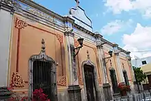 On the opposite side of the plaza is the municipal palace. This building was constructed in 1759 originally as a royal treasury (casa real). Later it became a municipal jail.[1][4] After Independence, it was renovated to become the main governmental building. It is Neoclassical in design and it has unique arches in the front, which were roofed in 1834.[1] There is also a mural dedicated to the Cristero War.[5]