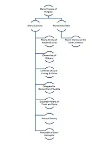 A theory claims that Marie-Thérèse of France, daughter of Louis XVI and Marie Antoinette, swapped identities with her adoptive sister, Ernestine Lambriquet, when she was released from the Temple.[1]