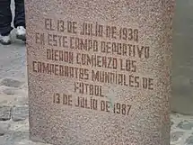 Due to various factors, it is considered a historical stadium.[5][6][7] Built in 1900, it is the oldest current stadium in America and the fifteenth in the world.[8][9] But it mainly stands out for having hosted the 1930 FIFA World Cup, playing one of the first two matches in the history of the competition, when on 13 July 1930 United States defeated Belgium 3–0 in Group D. FIFA remembered this fact when in 2005 a delegation headed by its president, Joseph Blatter,[10] came to visit the reforms and placed a commemorative plaque at the stadium. This historical fact was remembered by FIFA on two occasions: 1987 and 2005.[11]