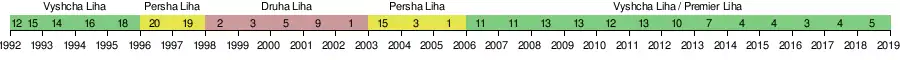In the season 2005–06 the team won first place in the Persha Liha, and had been promoted to the Vyscha Liha. Zorya was one of the original twenty teams to debut for the first season of the Ukrainian Premier League. The team played for five seasons until the 1995–96 season in which they finished eighteenth and were sent down to the Persha Liha. Zorya relegated to Druha Liha in 1996–97 season but she returned to Persha Liha in 2003–04 season.