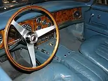 In the interior, the car features leather seats, a faux burled walnut dashboard with full instrumentation provided by Jaeger-LeCoultre, and a make up kit located in the back of the centre armrest, consisting of a chrome-handled brush and comb, and two perfume bottles, the latter albeit being supplied empty by the factory.