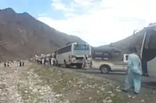 The convoy of four buses were travelling from Rawalpindi, Punjab to Gilgit, Gilgit Baltistan. On an empty stretch of the Karakoram Highway (KKH), Kohistan, (an area with a high Sunni population[2]), 10 to 12 gunmen in military uniform flagged the bus for stopping. After the bus halted, gunmen boarded and asked for the passenger's identity cards. After checking them, the gunmen dragged a group of Shia men including three children off the bus.[1] They were made to stand in a line by the roadside. Their hands were tied to their back and then shot.[3] After the shooting the gunmen resorted to aerial firing and moved to the nearby hilly areas.[3]