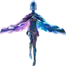 Fi is a humanoid spirit that resides within a sword called the Goddess Sword, which eventually becomes the Master Sword.[6] According to Hyrule Historia, she was designed to appear aged 13 or 14. She has a metallic appearance and her voice is robotic, which gives the impression that she displays no emotion. She wears a cape, which opens up when she spins. Her appearance is predominantly blue and purple in colour. Beneath her cloak Fi has no arms, though when she dances the cloth moves as though it were her limbs. She wears a blue gem on her chest, a purple miniskirt and leggings. Her feet are bare but she displays no toes.[7] Fi was designed to resemble the sword that she inhabits. The shape of her cloak mimics the design of the sword's crossguard, the pattern on her legs mimics the cross grid pattern on the sword's hilt and her blue and purple colour scheme also reflects the sword's prominent colours. Fi's figure is feminine in appearance but the character is officially genderless. In an interview with Nintendo Official Magazine, producer Eiji Aonuma stated that "Fi is not female".[4]