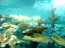 For the attraction, the Imagineers used more than 30 tons of recycled crushed glass to "paint" the coral and rockwork in the lagoon. Imagineers also created more than 40 colors for the lagoon area, such as Yamber (a cross between yam and amber), Mango Mud, Toast, Blue Feint (barely blue), Aqua Jazz, Swamp (dark green/amber), Danger Red, Burning Coal, Split Pea, Earth, Phantom and Peritwinkle.[8][9] The submarines were also converted from diesel fuel to electric power.[10]