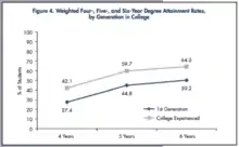 DeAngelo[74] provides statistics on graduation rates among FGCS and non-FGCS in a framework of four, five, and six years as well as a table that breaks down the degree attainment by race/ethnicity. These images from the study provide a breakdown, and show the huge gaps in degree attainment.[74] A new study revealed that only 27 percent of first-generation students will earn a bachelor's degree within four years of entering college, lagging far behind their continuing-generation peers.[75]