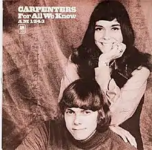 "For All We Know" is a soft rock song written for the 1970 film Lovers and Other Strangers, with music by Fred Karlin and lyrics by Robb Wilson (Robb Royer) and Arthur James (Jimmy Griffin). Both Royer and Griffin were founding members of the soft rock group Bread. It was originally performed, for the film's soundtrack, by Larry Meredith.[1] The best known version of the song is by American pop duo the Carpenters which reached No. 3 on the US Billboard Hot 100 chart and No. 1 on the US Billboard Easy Listening chart in 1971. The song was also a hit for Shirley Bassey at the same time in the United Kingdom. It has since been covered by various artists including Petula Clark.