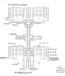 The 1910-1914 work (due to inferior concrete in the original construction) added flank shell and powder storage rooms to both batteries and also a central magazine to Battery Lincoln (see plan above-right, with dimensions). These additional rooms are at the surface on the Battery Lincoln (west) side, but underground for Battery Kellogg (on the east). Although on the Battery Lincoln side the roofs of these magazines are today on the surface, originally all of these magazines were covered with 10 to 20 ft. of earth, as protection against enemy shells and bombs. This new construction expanded the magazines' storage capacity by a tremendous amount. The old (1896) corridors offered about 3,500 sq. ft. of storage. The new work added almost 15,000 sq. ft. of new storage capacity.[18] As part of this rework Battery Lincoln's M1886 mortars were replaced with M1890MI mortars; the same was done with Battery Kellogg's mortars in 1915. During World War I, two mortars each were removed from Pit B of Battery Lincoln and Pit B of Battery Kellogg. This was done to improve the rate of fire of the remaining mortars in the pit; in most cases this was done at all mortar pits, but not at Fort Banks. The removed mortars became potential railway artillery.