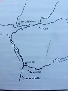 Fort Ellis was a British fort or blockhouse built during the French and Indian War, located at the junction of the Shubenacadie and Stewiacke Rivers, close to Stewiacke, Nova Scotia, Canada.[1] The location was labelled Ville Pierre Hebert by Charles Morris. The 14 Acadian families in the area vacated with the Acadian Exodus.[2] Charles Morris recommended a Fort on the Shubenacadie River in 1753.[3] Governor Lawrence first considered the fort in 1754 as a means to protect Halifax from Mi'kmaq raids.[4] Lawrence decided the fort would not be effective until after the Battle of Fort Beauséjour. The fort was completed on October 18, 1761, shortly after the Halifax Treaties were signed.[5] The fort was to guard the new road built to connect Truro and Halifax against Mi'kmaq raids. The fort was called Fort Ellis after Governor Henry Ellis, who was appointed governor weeks after the forts completion. The fort was never garrisoned and eventually abandoned in 1767. Fort Belcher, named after Governor Jonathan Belcher, was built on Salmon River in Lower Onslow, Nova Scotia (1761–67).[6] Fort Franklin was built at Tatamagouche in 1768, named after Michael Francklin and lasted only a year.[7][8] Fort Morris (Nova Scotia) was named after Charles Morris.