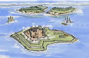 The initial plan by the fort's namesake François Gaston de Lévis, Duc de Lévis, called for a stone fort armed with 200 guns and a garrison of 2,500.[6] This did not have time to come to fruition and Fort Lévis was a large earthen and wood redoubt, which was one-log thick.[7] There were casemates along the inner defenses, some were covered with open sides, while others were not covered. There were four barracks buildings and an armourer and blacksmith's shop, all located centrally. The island, located midstream of the St. Lawrence River, had a small harbor for vessels.[8] The head of the fort's hornwork faced west with demi-bastions facing east.[3]