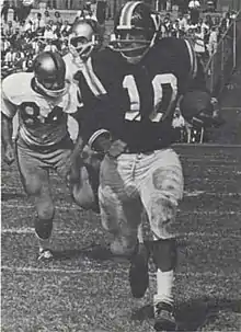 ![]() Frank Loria returns a punt for a touchdown in VPI's 1966 game against Vanderbilt. Loria's #10 is one of only four numbers retired by Virginia Tech. | |