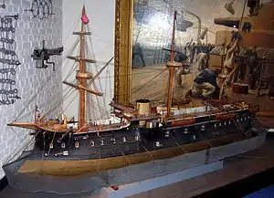 ![]() A model of Trident in the Musée national de la Marine, Paris, with her torpedo net deployed | |