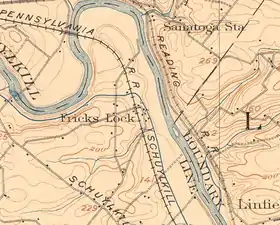 While some buildings date from the American Revolutionary War era, the village name was a result of the "Schuylkill Navigation" canal. The canal required construction, in the early 1820s, of a set of locks at that point along the Schuylkill River. Locks #54 and #55[3] were built on farmland acquired from John Frick and the village became known as Frick's Locks. The village thrived due to the economic stimulus of the canal. Eventually the commercial canal traffic declined toward the turn of the century and gave way to the railroad. Frick's Locks had become the singular Frick's Lock after the Pennsylvania Schuylkill Valley Railroad arrived and built a station with the latter name. The canal was filled in starting in 1942. While the railroad eventually declined after Conrail was formed on April 1, 1976, the village remained inhabited until near the end of the 20th century.
