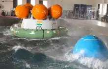 ![]() Gaganyan crew module undergoing survival and recovery test at Water Survival Test Facility (WSTF) of the Indian Navy | |