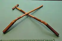 A gee-haw whammy diddle is a mechanical toy consisting of two wooden sticks. One has a series of notches cut transversely along its side and a smaller wooden stick or a propeller attached to the end with a nail or pin. This stick is held stationary in one hand with the notches up, and the other stick is rubbed rapidly back and forth across the notches. This causes the propeller to rotate. Sometimes also known as a ouija windmill, a hoodoo stick or a VooDoo stick. The word whammy is sometimes whimmy and the word diddle sometimes doodle, giving it three possible other names, and the gee-haw may also be dropped.