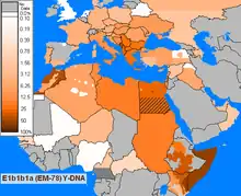 It is thought to have originated in North Africa 14,200 years ago.[33] Its parent clade E1b1b (E-M215) is believed to have first appeared in Horn of Africa about 42,600 years ago.[34]