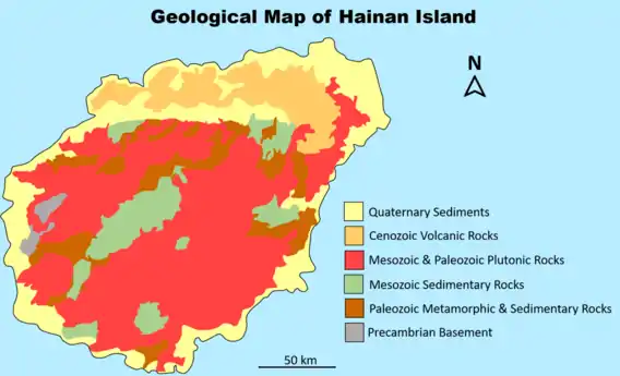 Hainan is mainly covered by igneous rocks emplaced from Permian through Cretaceous periods.[2] Structurally, there are two main sets of faults, one trending east and the other northeast.[2] The formation of the oldest fault, Gezhen shear fault, can even be dated back to the Precambrian times.[1]