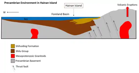 The Precambrian rock layers are not well exposed in Hainan Island where the outcrops are mainly found in its western part.[1][2] The crustal basement of the Island had an earliest age probably up to ca. 4000 to 3800 Ma.[7] The continental crust was then reworked in the later geological history. The Paleoproterozoic or older basement identified with the age of ca. 2560 Ma showed granulite facies metamorphism which mainly had an assemblage of gneissic amphibolite, charnockite and granulite.[8]