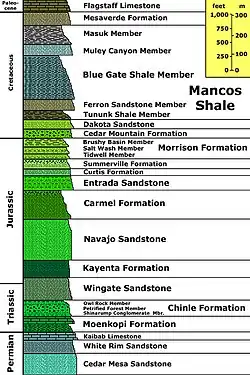 Approximately 94 to 85 million years ago, the seaway advanced onto and retreated from land as it laid down the Mancos Shale.[17] The Mancos is composed mostly of shale but two of its members, the Ferron and Muley Canyon, are sandstone that were laid down when relative sea level temporarily dropped. The five Mancos members from oldest to youngest are: