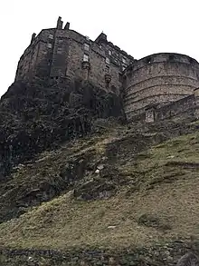 After the Lang Siege of Edinburgh castle was concluded in August 1573, Douglas supervised the rebuilding of part of the back wall and other repairs, buying lime, sand, slate and glass.[2] Part of the running expenses, or "sustenation" of the castle was paid to Douglas from the customs of Edinburgh town by Robert Gourlay.[3] Parkhead is credited with building the half-moon battery at Edinburgh castle, the Historie of King James the Sext records that Regent Morton appointed him captain, and caused "masonis to begin to redd (clear away) the bruisit wallis, and to repaire the foirwark to the forme of ane bulwark, platt and braid above, for the resett and ryving (receiving) of many canonis."[4] Some building accounts from this work survive.[5]