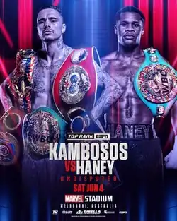 George Kambosos Jr vs Devin Haney, billed as Undisputed, was a lightweight unification professional boxing match contested between WBA (Super), IBF, WBO, and The Ring champion, George Kambosos Jr, and WBC champion, Devin Haney. The bout took place on 5 June 2022, at Marvel Stadium in Melbourne, Australia, with the winner set to become the first undisputed lightweight champion since Pernell Whitaker in 1990, and the first in the four-belt era.[1]