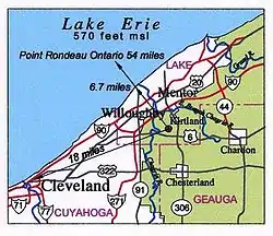 Gildersleeve Mountain also has views of Lake Erie from locations near the summit. From one location the view to the west and southwest affords a view of the downtown Cleveland skyline, 18 miles (29 km) away. On clear days the stacks in Lorain or Avon Lake may be visible, and on exceptional days the plume from cooling towers at the Davis-Besse, or Permian, nuclear power stations may be visible far to the west.