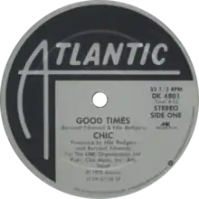 "Good Times" is a disco soul song by American R&B band Chic from their third album Risqué (1979). It ranks 68th on Rolling Stone's list of the 500 Greatest Songs of All Time,[1] and has become one of the most sampled tunes in music history, most notably in hip hop music. Originally released with "A Warm Summer Night" on the B-side, it was reissued in 2004 with "I Want Your Love" on the B-side, a version which was certified Silver in the UK.[2]