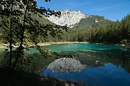 Grüner See (Green Lake) is a lake in Styria, Austria in a village named Tragöß, which is part of the municipality Tragöß-Sankt Katharein. The lake is surrounded by forests and three mountains: Pribitz (1,579 m), Meßnerin (1,835 m) and Trenchtling (Hochturm) (2,081 m), all part of the Hochschwab Mountains.[1] The name "Green Lake" originated because of its emerald-green water.[1] The clean and clear water comes from the snowmelt from the karst mountains and has a temperature of 6–7 °C (43–45 °F).[1] During winter, the lake is only 1–2 m (3–7 ft) deep and the surrounding area is used as a county park.