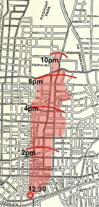 A corridor was burned due north between Jackson (now Parkway and Charles Allen) and Boulevard, with a few prominent bulges at Highland and just south of Ponce de Leon Avenue. At Houston Street, the fire was still being stopped on the east by Boulevard (just sparing John Wesley Dobbs' block). When the fire reached Highland, it raced both east and west through many fine homes. Around 4:00 in the afternoon, fire-fighters had begun to stall the fire by using dynamite to destroy many homes along Pine, Boulevard and finally Ponce de Leon.