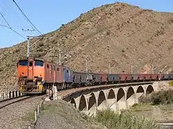 ![]() Train approaching Laingsburg crossing the bridge over the Buffels River, the upper section of the Groot River | |