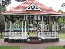 Foster's design was for a timber-framed bandstand resting on brick piers set on a concrete base. The structure had a pyramid roof clad with fibrous-cement tiles (a very new product in Australia at that time) and was simply but effectively decorative with gablets to each side of the roof (these had shaped timber in-fills); a finial at the roof peak and at the end of each gablet; timber balustrades and valances with fretwork panels around the pavilion sides; and honeycomb brick infill between the piers. The contract was let in September 1919 to Mr TJ Dale of Gympie, who tendered with a price of £550/13/-. Work was completed in time for the Prince of Wales' visit on 3 August 1920, when a civic address was presented to him from the bandstand. Foster also designed a lighting scheme for the park, using 1000 cp (candle power) lights at the Mary Street entrance gates and in the park, and eight lights of 130 cp each in the bandstand. At a later date, an additional set of concrete stairs was added to the east side of the bandstand, and still later (late 1960s or 1970s), the roof was re-clad with terracotta tiles.[1]