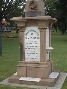 Of the other memorials positioned around the park, the sandstone and marble monument to James Nash is the most prominent. It stands in the north-west corner of the park, facing the intersection of Reef Street, River Road and Monkland Street. Designed in a classical style, it has a square base, Corinthian-order pilasters at each corner, a wide cornice, and is topped by a sandstone block ornamented with a carved wreath. Marble panels are fixed between each pilaster; two have projecting marble basins and one is inscribed with the words "Erected to the Memory of James Nash, who discovered the Gympie goldfield, 16th October 1867. Born at Beanacre, Wiltshire, England, 5th September 1834. Died at Gympie 5th October 1913." West of the bandstand is a "Peace Pole" memorial that has one plaque attached to a decorated timber pole and another on a rock at its base. Aligned with the bandstand to the south-west is a 1988 War Memorial, which consists of a large sandstone boulder with a small cross carved in relief, a large granite plaque and a small brass plaque below it. A low, semi-circular concrete masonry wall surrounds the boulder and has two brass plaques on its inner face, commemorating the deaths of individual soldiers. A nearby flagpole associated with this memorial stands to the north-west.[1]