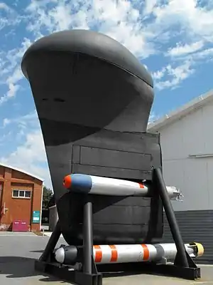 The main armament of the Oberons consisted of six 21-inch (533.4 mm) torpedo tubes.[1] The British Mark 8 torpedo was initially carried by the submarine; this was later replaced by the wire-guided Mark 23.[8] During the 1980s, the Australian Oberons were upgraded to carry United States Navy Mark 48 torpedoes and UGM-84 Sub Harpoon anti-ship missiles.[5] As of 1996, the standard payload of an Australian Oberon was a mix of 20 Mark 48 Mod 4 torpedoes and Sub Harpoon missiles.[6] Some or all of the torpedo payload could be replaced by Mark 5 Stonefish sea mines, which were deployed through the torpedo tubes.[6][8] On entering service, two stern-mounted, short-length 21-inch (53 cm) torpedo tubes for Mark 20 anti-submarine torpedoes.[9] However, the development of steerable wire-guided torpedoes made the less-capable aft-firing torpedoes redundant; they were closed off, and later removed during a refit.[9]