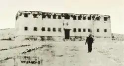 The camp was originally built as an army barracks which had never been finished,[8] and its structures were looted in 1941. As a result, it was in poor shape when the first prisoners started arriving at the beginning of September 1943,[5] and the situation would deteriorate further in the months to come, when the camp came under German control.[8] The camp had a roughly rectangular shape, surrounded by a triple barbed wire fence, with guard towers at every 200 m (660 ft). The camp's gate was on the western side of the fence. Most buildings were clustered on the northern half of the camp.[9] Blocks 1 to 4 were located there, built in a staggered line towards the East. These were two-storey barracks buildings, divided in two equal but separate sections, western and eastern, with separate entrances to each.[9] In addition, the north-eastern corner housed storage houses, the mess hall, the baths (Block 16), where the women's solitary confinement cells were also located, the workshops (Block 21) and the camp headquarters (Block 20). The infamous Block 15, located to the east of the headquarters, was the solitary confinement facility, with the camp guard's quarters and mess room.[9] In the south-eastern corner there was the isolated women's wing (Block 6). Under the Germans, the first floor housed Jewish women, while the second floor was reserved for Christians.[9] In total, over 300 Christian and 2,500 Jewish women passed through Haidari beginning on 7 December 1943, including heroines of the Resistance such as Iro Konstantopoulou or Lela Karagianni (executed on 5 and 8 September 1944 respectively).[10]