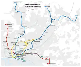 The Hamburg U-Bahn is a rapid transit system serving the cities of Hamburg, Norderstedt and Ahrensburg in Germany. Although referred to by the term U-Bahn (the "U" commonly being understood as standing for Untergrund "underground"), most of the system's track length is above ground. The network is interconnected with the city's S-Bahn system, which also has underground sections. It is operated by Hamburger Hochbahn within the Hamburger Verkehrsverbund (HVV). It was opened in February 1912,[4] and comprises four lines serving 93 stations,[2] with a route length of 106.4 kilometres (66.1 mi) in 2019.[6]