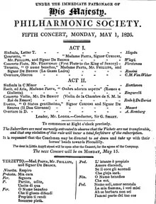 The concert hall there, where concerts started under Bach in February 1775, became one of the principal musical venues in London. For these concerts the convention was that "The Ladies' tickets are Black, and the Gentlemen's Red."[3] An entry from April 1776 in the diary of Edward Piggot gives the following description of a concert:[4]