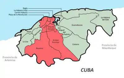 | Playa | Miramar, Buenavista, La Ceiba, La Sierra, Kolhi, Siboney, Atabey, Santa Fe, Jaimanitas, Flores, Cubanacán, Almendares. |