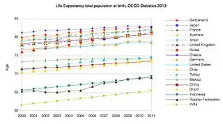 - "OECD.StatExtracts, Health, Health Status, Life expectancy, Total population at birth, 2011" (Online Statistics). OECD.Stats. OECD's iLibrary. 2013. Retrieved 22 November 2013.