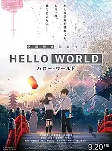 Hello World (Japanese: ハロー・ワールド), stylized as HELLO WORLD, is a 2019 Japanese animated science fiction romantic drama film directed by Tomohiko Itō from an original screenplay written by Mado Nozaki. Produced by Graphinica and distributed by Toho, the film is set in a futuristic Kyoto where a high school student named Naomi Katagaki encounters a person claiming to be himself, who time-traveled from 10 years in the future to save a classmate named Ruri Ichigyō.
