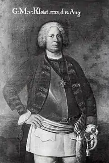 During the War of Austrian Succession, in 1741 as a lieutenant general he commanded the city Kolberg. As a participant in the Battle of Mollwitz, his infantry regiment not only held its line despite the flight of the Prussian cavalry, but subsequently attacked the Austrian line with such ferocity that he and his soldiers received special mention in Kurt Christoph Graf von Schwerin's report. He was wounded in the fighting.[8] The regiment's actions here reflected the iron training imposed by the prince of Anhalt Dessau on his subordinates, and their subsequent training of their own regiments. In addition, the Prussian infantry benefited not only from the discipline of drill but also the latest in military technology; unlike their Austrian counterparts, they had iron ramrods which allowed them to fire faster and more accurately.[9] After the battle, he was made a Knight of the Order of the Black Eagle on 15 April 1741, and later awarded the Order Pour le Mérite. During the Silesian Wars, in 1744 he acquired as war booty the gold-plated carriage originally belonging to Jan Sobieski; Kleist gave the carriage to his local church.[1]