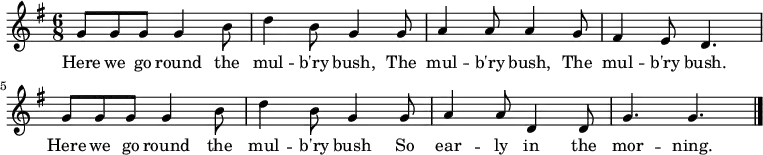 Here we go round the mulberry bush, The mulberry bush, The mulberry bush. Here we go round the mulberry bush On a cold and frosty morning.