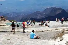 Hierve el Agua (Spanish for "the water boils") is a set of natural travertine rock formations in San Lorenzo Albarradas, Oaxaca, Mexico that resemble cascades of water.[1][2] The site is located about 70 km east of Oaxaca City,[3] and consists of two rock shelves or cliffs which rise between fifty and ninety metres from the valley below, from which extend nearly white rock formations which look like waterfalls. These formations are created by fresh water springs, whose water is over-saturated with calcium carbonate and other minerals. As the water trickles over the cliffs, the excess minerals are deposited, much in the same manner that stalactites are formed in caves.[1] One of the cliffs, called the "cascada chica" (small waterfall) or the Amphitheatre, contains two large artificial pools for swimming as well as a number of small natural pools.[4][5] One of the artificial pools is very near the edge of the cliff.[3]