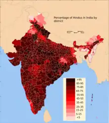 The Hindu population has increased more than three times from 303,675,084 in 1951 to 966,257,353 in 2011, but the Hindu percentage share of total population has declined from 84.1% in 1951 to 79.8% in 2011.[16][17] When India achieved independence in 1947, Hindus formed 84% of the total population and pre-Partition British India had 66% of Hindus.[18]