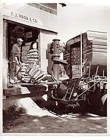 Grain, primarily corn and oats, was purchased from local farmers and shipped out on the railroad. Horses would pull grain-filled wagons up a ramp into the enclosed driveway, where the grain would first be weighed. The scale in the driveway was designed to raise the front axle of the wagon, while lowering the rear axle, and the grain was offloaded by hand into a receiving pit. From there it was elevated into bins via a wood-constructed vertical bucket elevator, which was powered by a 12-horsepower water-cooled gasoline engine. Once in the bins, the grain could then be unloaded onto railroad boxcars by gravity flow and shipped to other markets.[4]