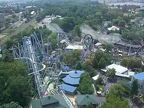 The 1990s started off with the creation of Minetown. The old penny arcade was replaced by a massive three-story building, housing the Minetown Arcade, Minetown Restaurant, and games. The Flying Falcon replaced Himalaya, and three kiddie rides replaced the Coal Shaker. Four roller coasters were added to Hersheypark in the 1990s. The Dry Gulch Railroad received a second steam engine, named "Janelle", to complement "Skooter", the former had a similar appearance, but was slightly larger and more powerful than the latter. Sidewinder, a Vekoma Boomerang coaster, was added in 1991.[12] In 1996, the wooden coaster Wildcat was added and was named after the Wild Cat that previously operated from 1923 to 1946.[12] Great Bear opened in 1998, the park's most expensive single ride to date. Wild Mouse opened in 1999. Several rides were also added during this decade. In 1994 the water plunge ride Tidal Force opened.[12] A Ferris wheel and Whip ride were added in 1997. Four other new rides were added in 1999. These include the Merry Derry Dip fun slide, Music Express, Chaos (since removed), and the Frog Hopper.