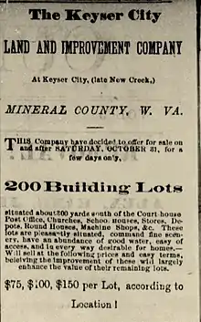 By 1844, Paddy Town fell into decline when the original post office closed. The town received an economic boost in 1852 when the Baltimore & Ohio Railroad, in search of a path through the Allegheny mountains, arrived.[8] The Paddy Town post office was re-established that year, with Edward Hitchcock McDonald as postmaster. McDonald's wife, Cornelia Peak McDonald, was an educated socialite from Alexandria, Virginia. She found the name "Paddy Town" to be "unaesthetic and wholly unacceptable." Due to her persistent lobbying, the Post Office Department in 1855 renamed the town's post office as Wind Lea, Virginia.[9] Sometime between 1855 and the start of the Civil War in 1861, however, the townsfolk renamed the village New Creek Station, after the creek that runs by it. This decision was supposedly "by common consent" to give the town a "more dignified" name.[10]