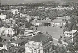 Citing a need to avoid confusion, distinguish itself from the University of Pennsylvania, and return to its roots by identifying itself with the city, the Western University of Pennsylvania, by act of the state legislature, was renamed the University of Pittsburgh in 1908. During this time, Pitt had also outgrown its accommodations on the North Side of Pittsburgh and its departments had been scattered throughout the city for years. The Department of Medicine was in West Penn Hospital, the departments of Dentistry and Pharmacy were in a building on a hilltop at Pride and Bluff Streets, and the Law School was in the former University building at Ross and Diamond Streets after having moved from the Orphan's Court in the Old Allegheny County Court House. To consolidate its components on one campus, WUP bought 43 acres (170,000 m2) of land in December 1907 in what is now the Oakland neighborhood of Pittsburgh and began relocating departments there by 1909.[24] The initial campus layout plan came from the winning submission from a national architectural contest that incorporated a Greek Acropolis design by Henry Hornbostel for 30 buildings.[25] However, due to financial and other constraints, only four of the buildings were constructed in this style, of which only Thaw Hall remains today. It was also during this period that the university, led by Chancellor Samuel McCormick, would again fend off pressures to abandon the school's commitment to liberal education in favor of more technical-based training. During his administration, McCormick would also lead the university into a new level of national recognition, expansion, and growth, as well as began institutional support of athletics.[18]