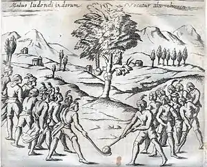 The first recorded use of the word hockey is in the 1773 book Juvenile Sports and Pastimes, to Which Are Prefixed, Memoirs of the Author: Including a New Mode of Infant Education by Richard Johnson (Pseud. Master Michel Angelo), whose chapter XI was titled "New Improvements on the Game of Hockey".[1] The belief that hockey was mentioned in a 1363 proclamation by King Edward III of England[2] is based on modern translations of the proclamation, which was originally in Latin and explicitly forbade the games "Pilam Manualem, Pedivam, & Bacularem: & ad Canibucam & Gallorum Pugnam".[3][4] The English historian and biographer John Strype did not use the word "hockey" when he translated the proclamation in 1720, instead translating "Canibucam" as "Cambuck";[5] this may have referred to either an early form of hockey or a game more similar to golf or croquet.[6]