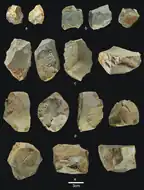 Although 41% of the section's assemblage consists of flakes, they are rather crude and large—averaging 38 mm × 30 mm × 11 mm (1.50 in × 1.18 in × 0.43 in)—either resulting from rudimentary knapping (stoneworking) skills or difficulty working such poor quality materials. They made use of the unipolar longitudinal method, flaking off only one side of a core, probably to compensate for the lack of preplanning, opting to knap irregularly shaped and thus poorer quality pebbles.[9]