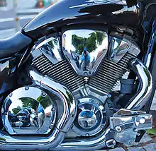 Although it was similar to the 1800, the 1300 was not the same engine with a smaller bore or shorter stroke, but a new design.[21] The 1300 engine used a 38 mm constant velocity carburetor unlike the fuel injected 1800. The single carb had a manual choke for cold starts,[22] and was heated by engine coolant to improve cold-weather operation. The configuration of the new powerplant was the same liquid-cooled overhead-cam 52-degree V-twin layout as its larger sibling, but the VTX1300 engine was designed around a single-pin crankshaft, unlike the 1800s dual-pin crank. As a result, the 1300 required dual two-axis primary counterbalancers to control engine vibration. The VTX1300 engine had a cable-operated clutch, instead of the hydraulic clutch of the VTX1800.[7] The 1300 engine used an air injection system and catalytic converters, similar to the bigger engine, as well as a lean fuel-air mixture to control emissions.[24]